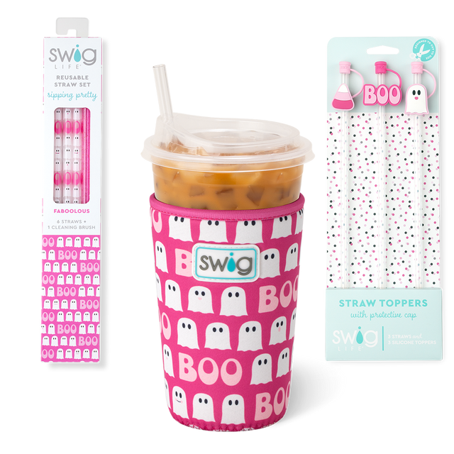 Accessory Bundle includes: one insulated Iced Cup Coolie with handle, one Reusable Straw set of 6 printed straws, and one Straw Topper set of 3 reusable straws with silicone charms featuring protective caps. Keep them all for yourself or share them with a friend!