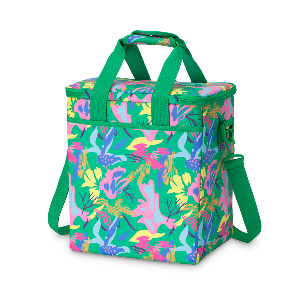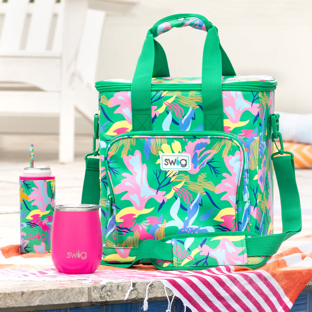Keep cooler and carry on! π§ Vibrant abstract hues of green and hot pink come together in this funky tropical design!